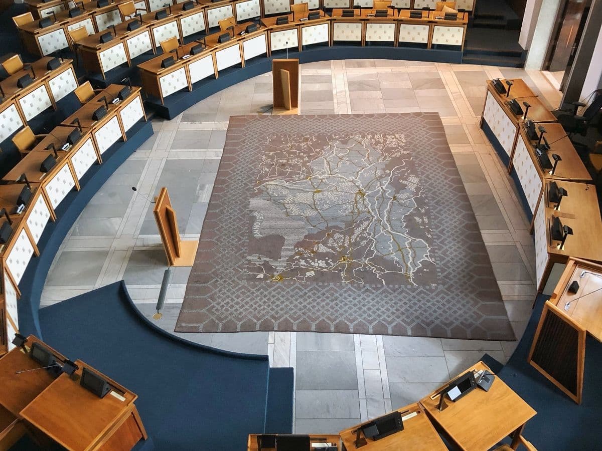 Midden in de Statenzaal van het Gelderse Huis der Provincie ligt een vloerkleed. Het is een geschenk van de Plattelandsvrouwen bij de oplevering van de nieuwbouw in 1954. Het kleed stelt zich bescheiden op: het voegt zich qua kleur en materiaal in de ruimte en stelt Gelderland voor. We zien de contouren van de provincie. Op zich weinig opzienbarends, totdat je de geschiedenis van de maakster leert kennen.