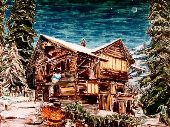 Kim: Ja wat zie ik? Ik zie van alles maar ik voel vooral heel veel als ik dit schilderij zie. Ik voel heel veel warmte. Het is een houten chalet en Zwitserland. Ik hou van Zwitserland. Chalets, die hebben vaak van die hoekbanken in de keuken. Het is hier avond, je ziet wat sterren. Er is vuur. Ja het is een plek waar ik heel graag zou willen zijn.